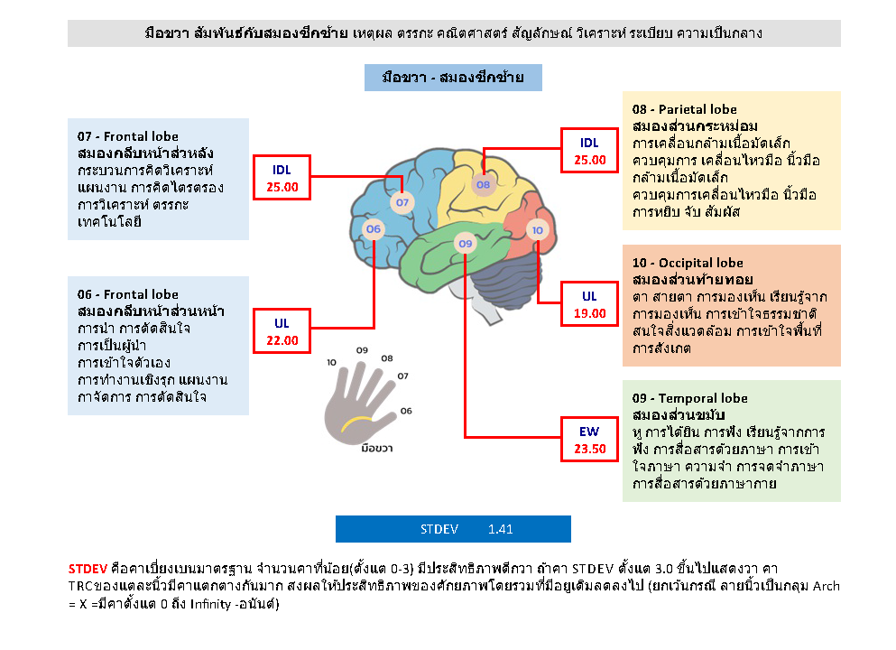 คุณรู้หรือไม่ว่า... เพียงแค่ลายนิ้วมือทั้ง 10 นิ้ว ก็สามารถบ่งบอก “ศักยภาพทางสมอง” และ “พรสวรรค์เฉพาะบุคคล” ได้อย่างแม่นยำ มือซ้าย(ปัญญา 5 ด้านที่มือซ้าย)สัมพันธ์โยงกับสมองซีกขวา ส่วนมือขวา(ปัญญา 5 ด้านของมือขวา) สัมพันธ์กับสมองซีกซ้าย ลายนิ้วมือทั้ง 10 นิ้วเชื่อมโยงกับสมอง โดยมือซ้ายสัมพันธ์กับสมองซีกขวา และมือขวาสัมพันธ์กับสมองซีกซ้าย ตรวจวัดค่า TRC และ STDEV เพื่อวิเคราะห์ศักยภาพทางสมอง และรูปแบบการเรียนรู้เฉพาะบุคคล