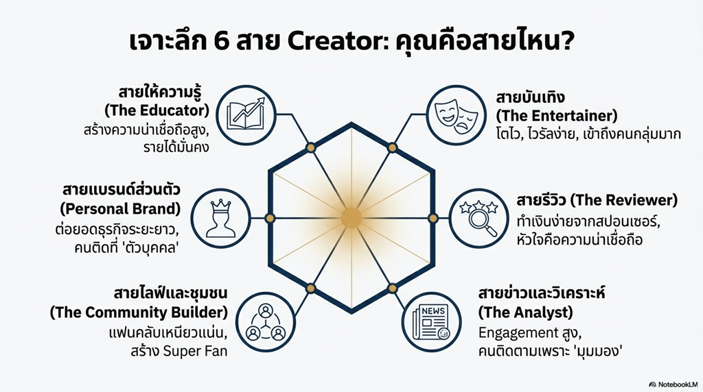 ทุกวันนี้ใคร ๆ ก็อยากเป็น Creator / Influencer แต่ความจริงคือ ไม่ใช่ทุกคนเหมาะจะดังในทางเดียวกัน บางคนเด่นสายสอน บางคนเด่นสายเล่าเรื่อง บางคนเหมาะสายรีวิว–วิเคราะห์ และหลายคนมี “สายรอง” ที่ทำเงินได้ดีกว่าสายหลักเสียอีก