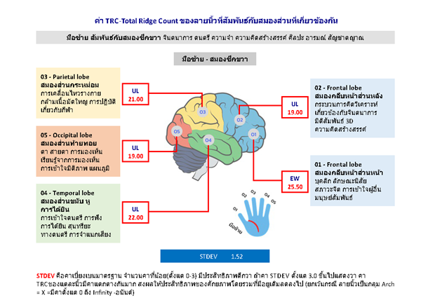 คุณรู้หรือไม่ว่า... เพียงแค่ลายนิ้วมือทั้ง 10 นิ้ว ก็สามารถบ่งบอก “ศักยภาพทางสมอง” และ “พรสวรรค์เฉพาะบุคคล” ได้อย่างแม่นยำ มือซ้าย(ปัญญา 5 ด้านที่มือซ้าย)สัมพันธ์โยงกับสมองซีกขวา ส่วนมือขวา(ปัญญา 5 ด้านของมือขวา) สัมพันธ์กับสมองซีกซ้าย ลายนิ้วมือทั้ง 10 นิ้วเชื่อมโยงกับสมอง โดยมือซ้ายสัมพันธ์กับสมองซีกขวา และมือขวาสัมพันธ์กับสมองซีกซ้าย ตรวจวัดค่า TRC และ STDEV เพื่อวิเคราะห์ศักยภาพทางสมอง และรูปแบบการเรียนรู้เฉพาะบุคคล