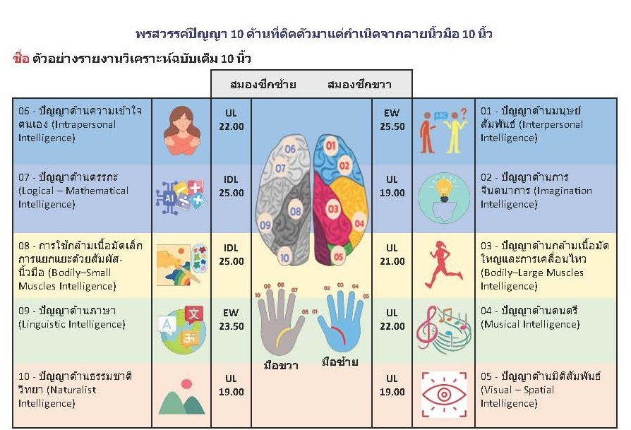 🧠 ตารางสรุปปัญญา 10 ด้านจากลายนิ้วมือบุคคล(ตามตัวอย่างรายงาน)