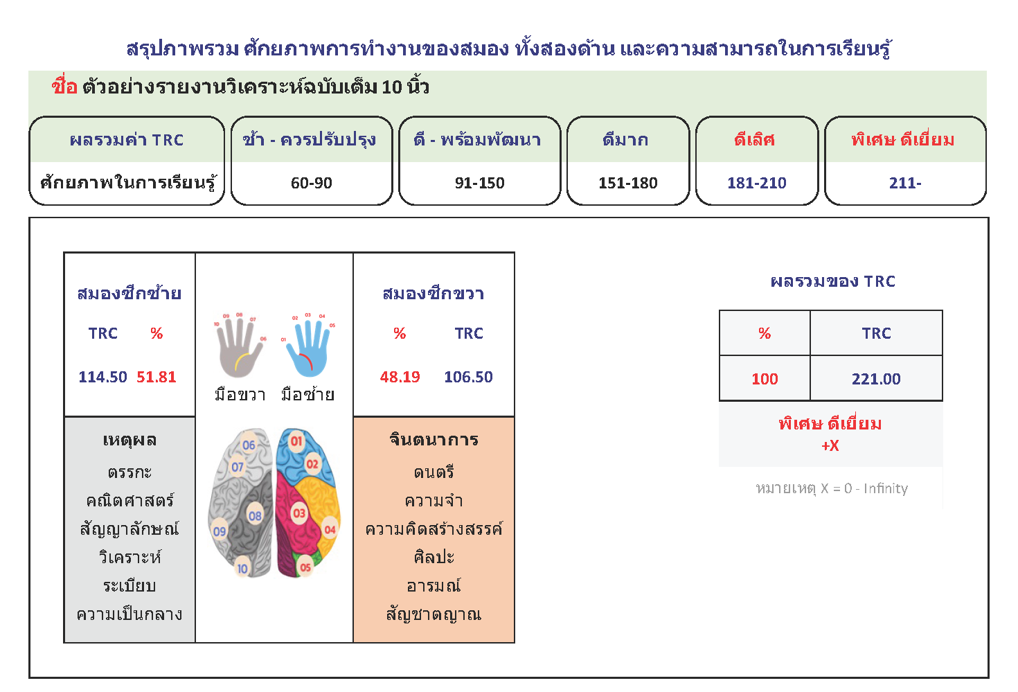 ค่า TRC จากลายนิ้วมือเชื่อมโยงกับสมอง บอกถึงศักยภาพการเรียนรู้ การคิด และปฏิบัติงานใน 5 ส่วนของสมองคือ ส่วนหน้ากลีบหน้า ส่วนหน้ากลีบหลัง ส่วนกลาง ส่วนกลีบขมัน ส่วนท้ายทอย